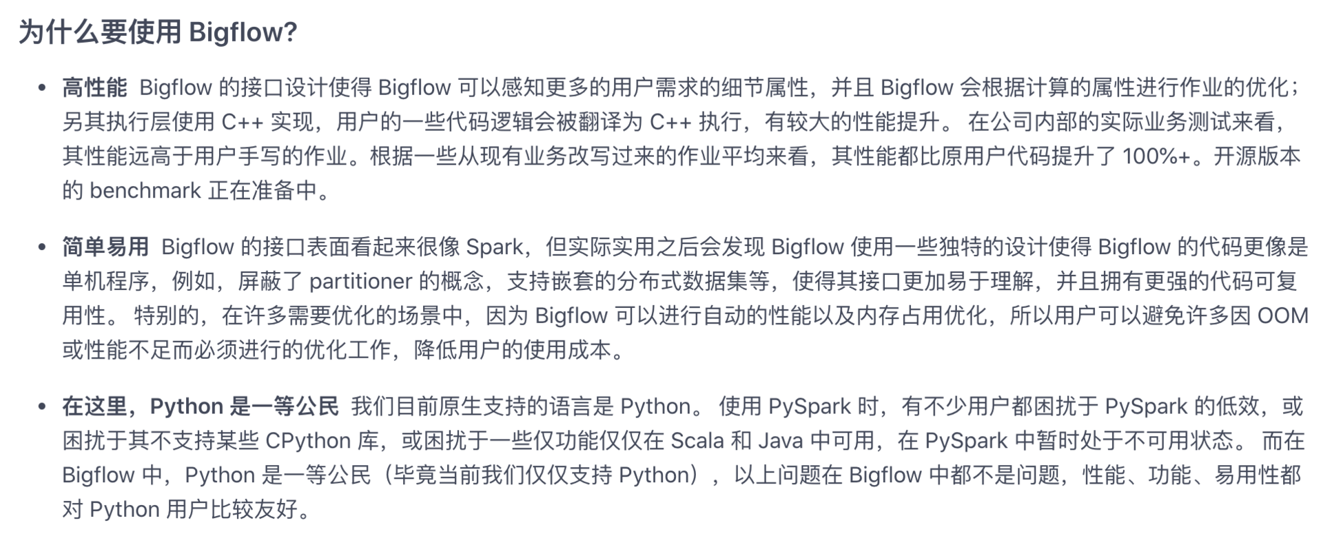 Baidu Bigflow 是百度的一套计算框架, 它致力于提供一套简单易用的接口来描述用户的计算任务,并使同一套代码可以运行在不同的执行引擎之上。